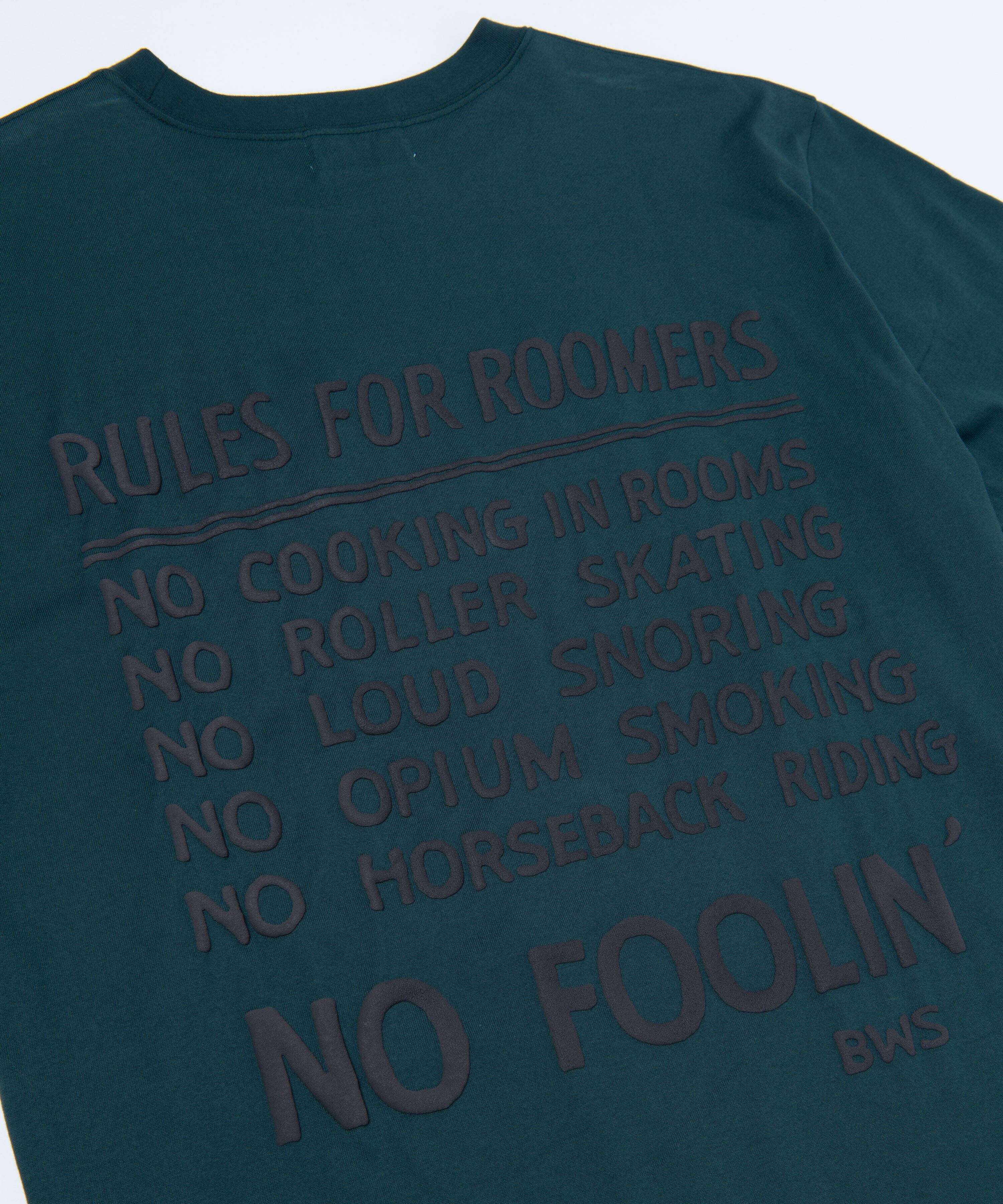 前面に「NO MEANING」、背面には部屋で決してやってはいけない禁則6箇条が発泡プリントされたフラタニティーカレッジT。オリジナルボディー。